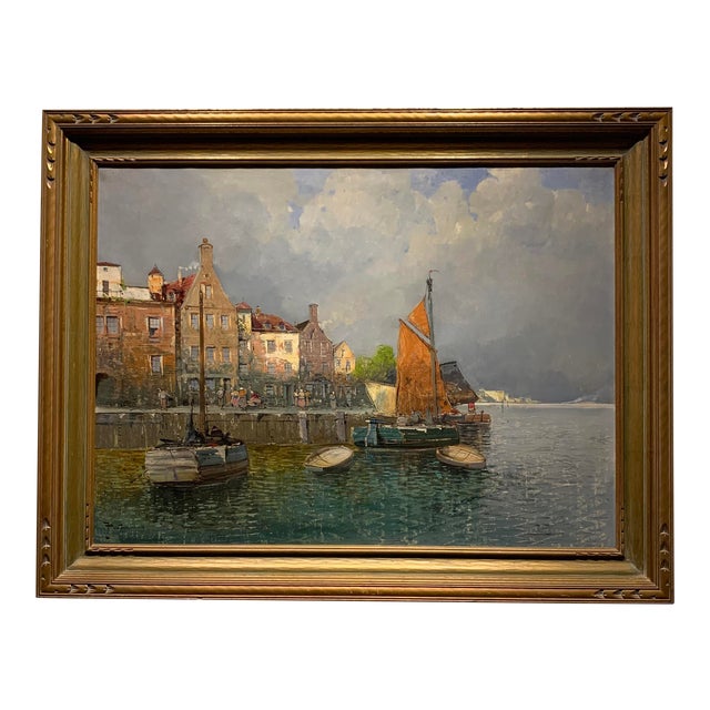 J Wagner German Port With Fishing Boats Oil On Canvas Painting With Original Frame Chairish